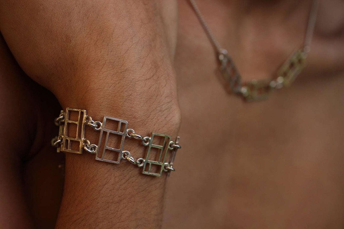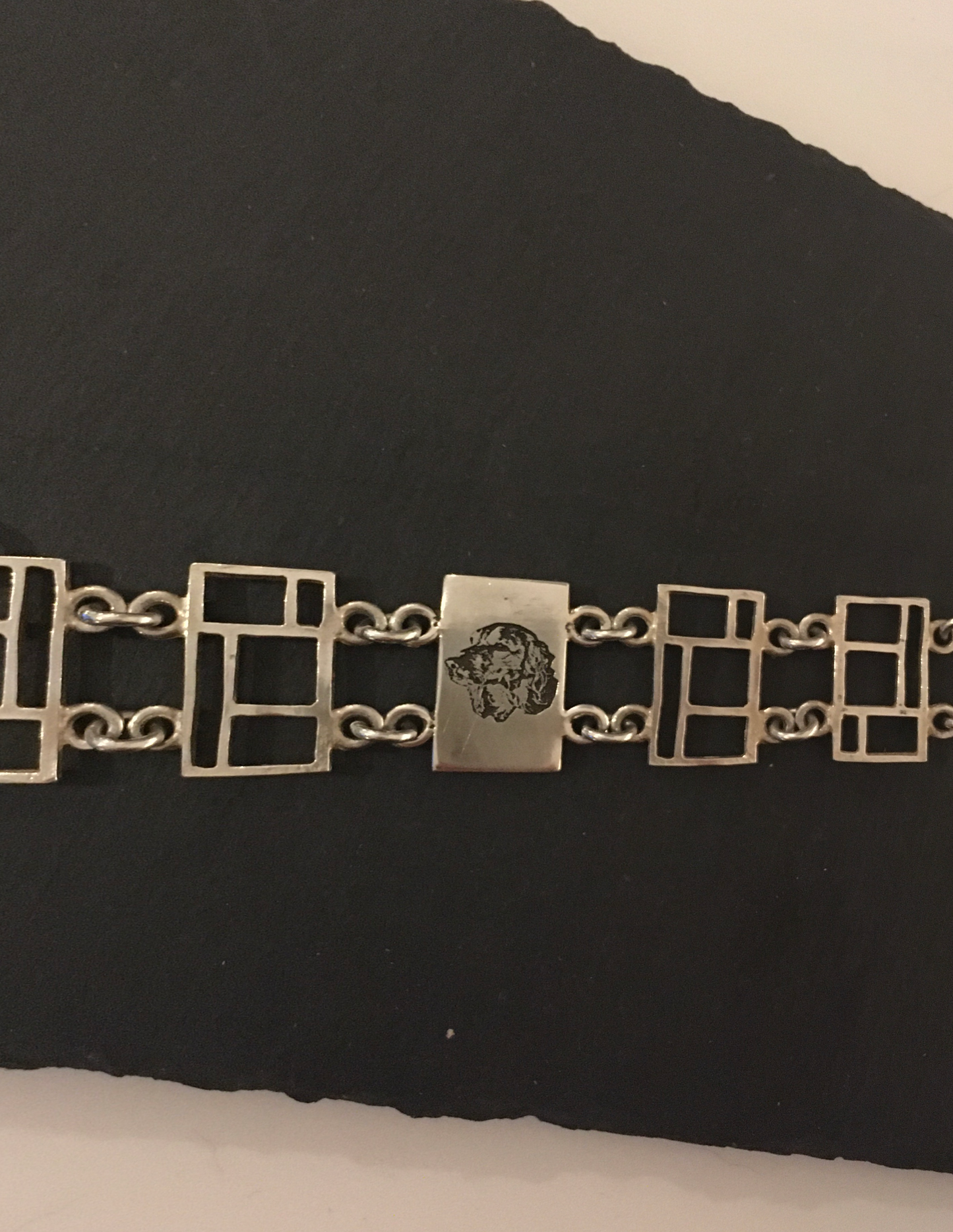 Een nieuw ontwerp waar we heel erg trots op zijn. De armband is opgebouwd uit zilveren schakels als art-deco venstertjes. Eén daarvan kan vervangen worden door een afbeelding of tekst. Bij aanduiding van de optie "zonder afbeelding" is deze schakel eenzelfde als de andere schakels. Op deze manier is het sieraad ook prachtig. Dit thema kan ook uitgevoerd worden als oorbel (één schakel) of halsketting (drie of meer schakels met dunne zilveren ketting).