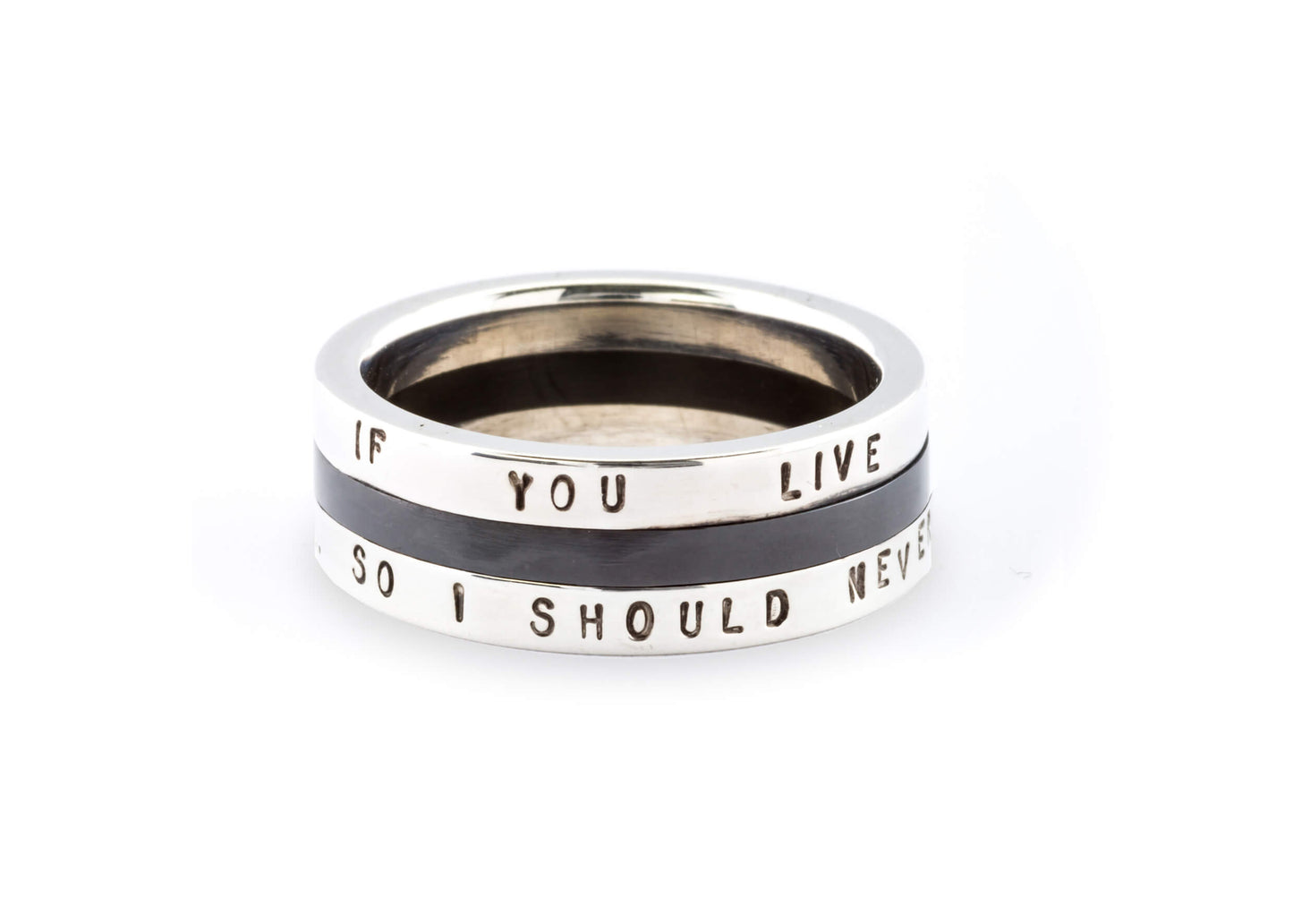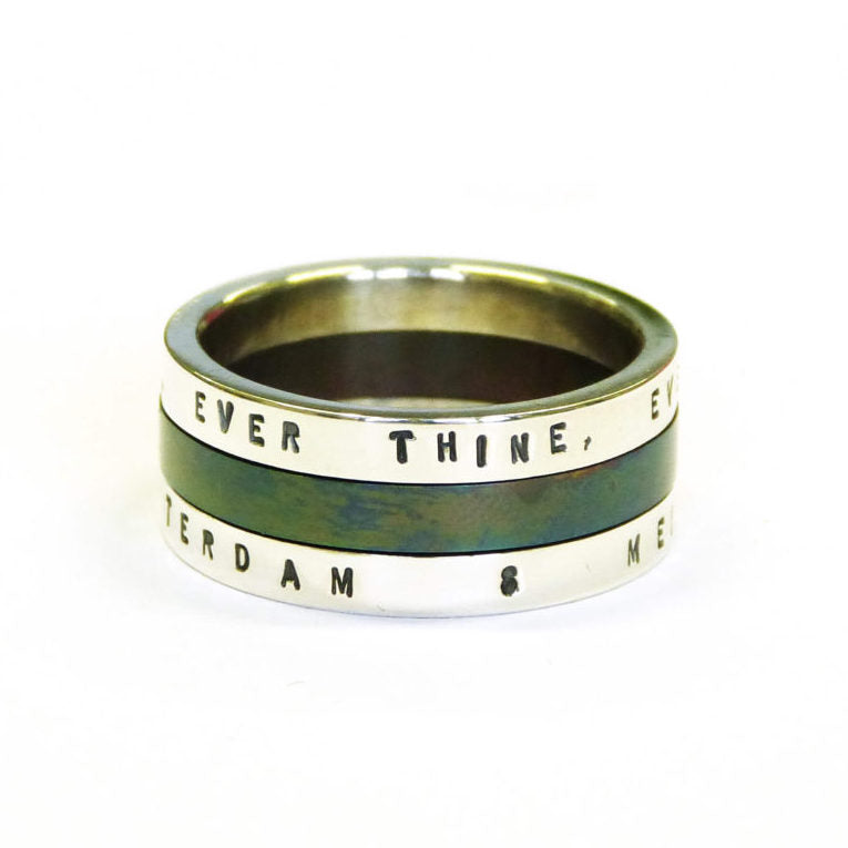 CombiRingen bestaan uit meerdere delen die aan elkaar vast zitten. Deze stoere zwart-zilveren ring is gemaakt van zilver en zirkonium. Zirkonium is een materiaal dat je niet zo vaak ziet in sieraden. Omdat zirkonium niet te solderen is zie je aan de zwarte zijde van de ring een aantal kleine klink-nageltjes zitten. Een echt stukje ambachtelijk handwerk.