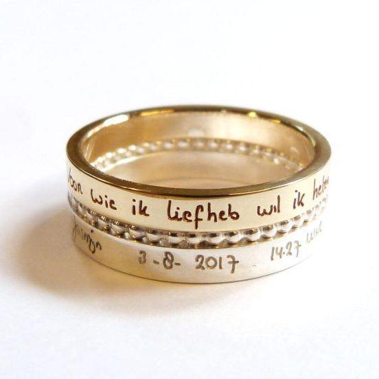 Een mooie ring voor tal van gelegenheden. De ring op de foto was voor een trotse oma die een ring heeft laten maken ter ere van de geboorte van haar kleindochter. Maar als trouwring kan deze ring natuurlijk ook. Je kan je eigen handschrift in de ring laten zetten maar als je liever een handgestempelde tekst wil of een gegraveerde letter neem dan even contact met ons op.