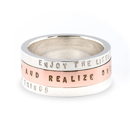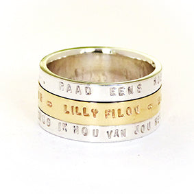 De draaiRing is gemaakt van zilver of goud of een combinatie van beide. Op de website zijn ook andere combinatie te vinden maar als je een combinatie zou willen die niet op de site staat kun je contact opnemen met Textring op nummer 32(0)479798949 of via email info@tekst-ring.nl
