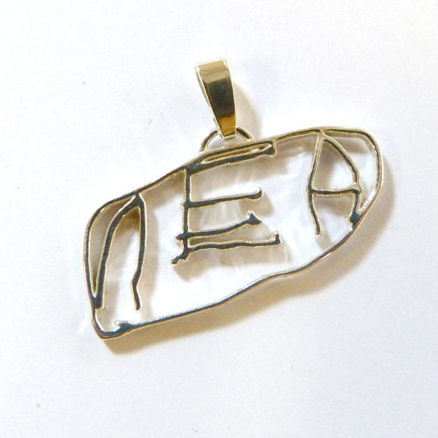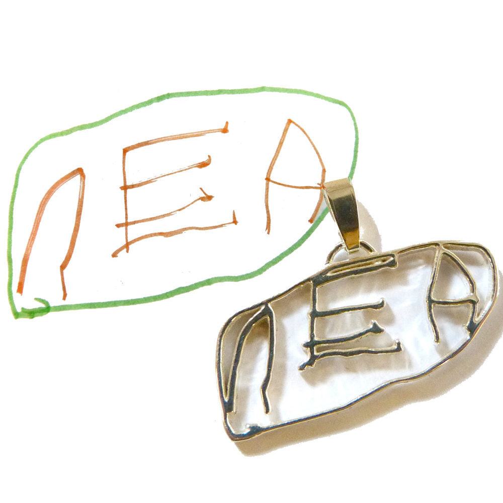 Mijn dochter is aan het leren om haar naam te schrijven...ze heet EVA maar de volgorde van de letters is nog wat lastig en de V is op zijn kop...NEA maakt ze er van. Super schattig, over een paar weken schrijft ze het wel goed, hoe leuk is het dan om dat te vereeuwigen in een hanger. Het kan met een naam maar een kop-poten poppetje is natuurlijk ook super cute in een hangertje.