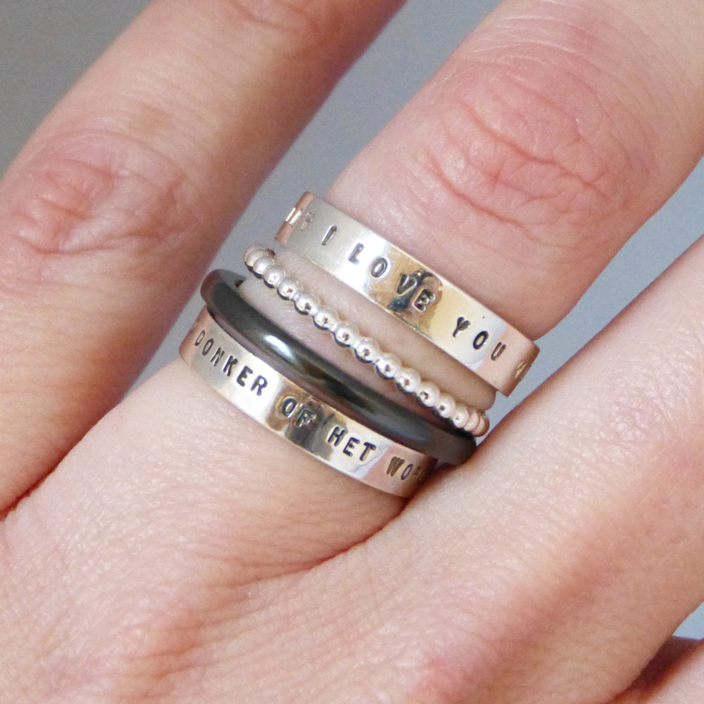 Deze ring bestaat uit een balletjes ring van 1,5mm breed en een zirkonium ring van 2mm breed. Daarnaast 2 zilveren ringen van 2,5mm breed waar je tekst in kan zetten. Per ring kun je maximaal 15 karakters plaatsen. De totale breedte wordt 8,5mm. De ringen zitten niet aan elkaar verbonden dus kunnen ook los of aan verschillende vingers worden gedragen.