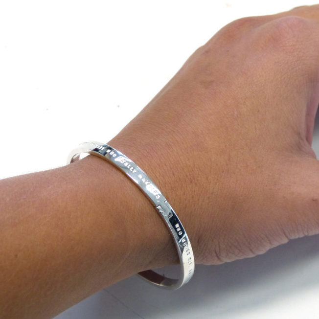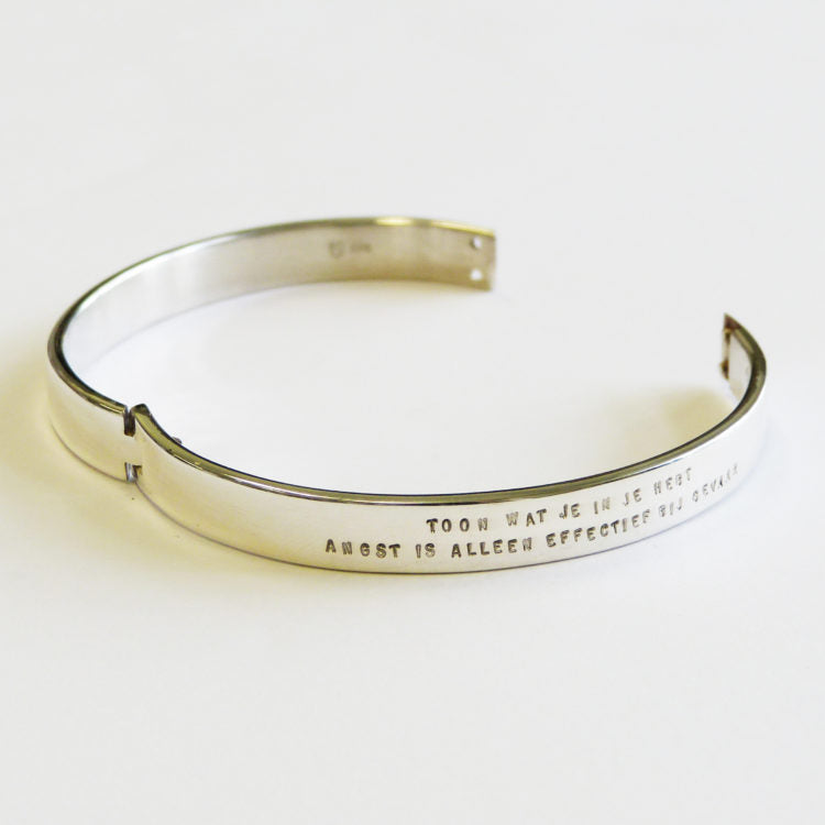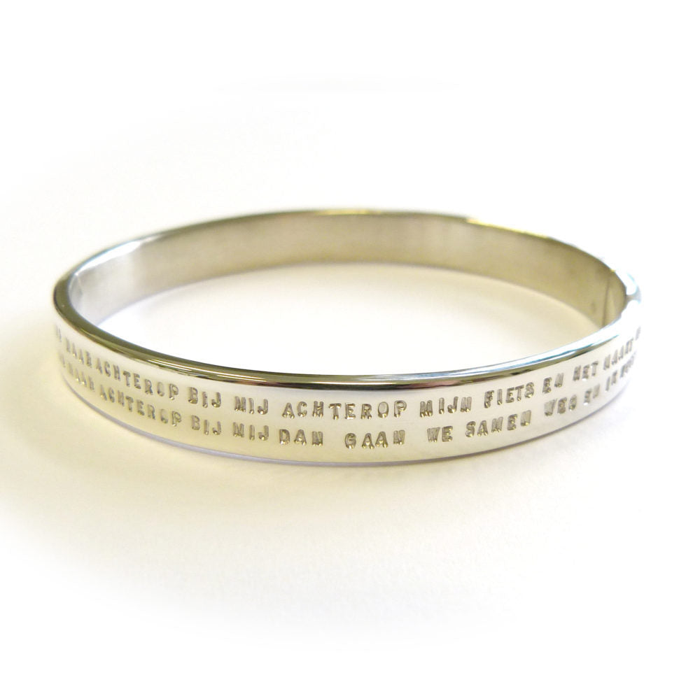 De stoere slavenarmband kan niet ontbreken in de collectie van Tekst-ring. Extra veel ruimte voor extra veel tekst.
