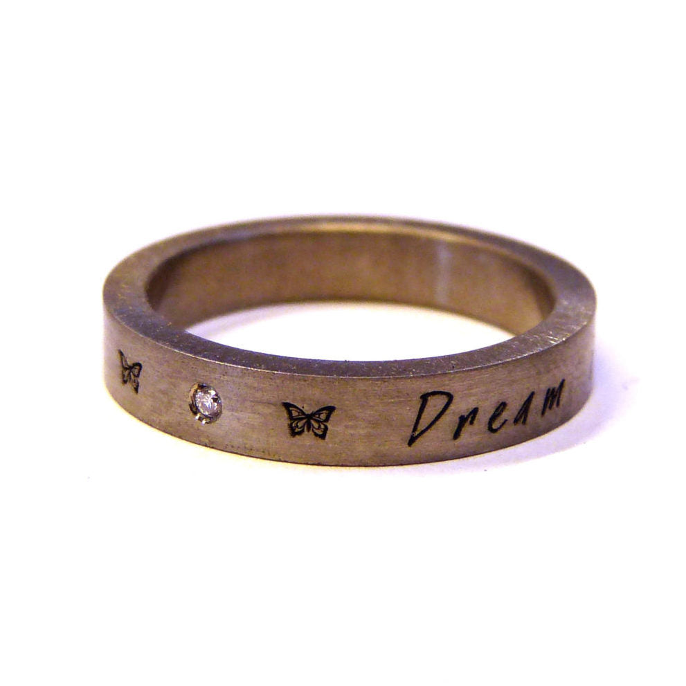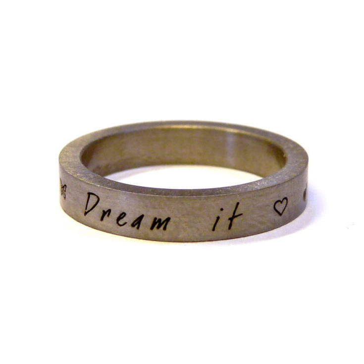 Je kunt je eigen tekst verzinnen en je hebt daarbij de keuze uit 5 verschillende lettertypes en diverse symbolen zoals een hartje of een sterretje. De tekst wordt met een laser in de ring gegraveerd daardoor heeft de ring een moderne uitstraling.