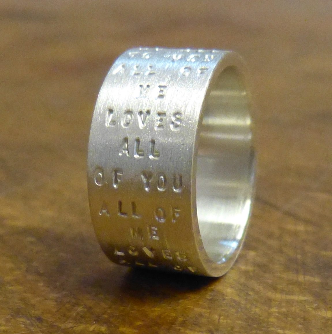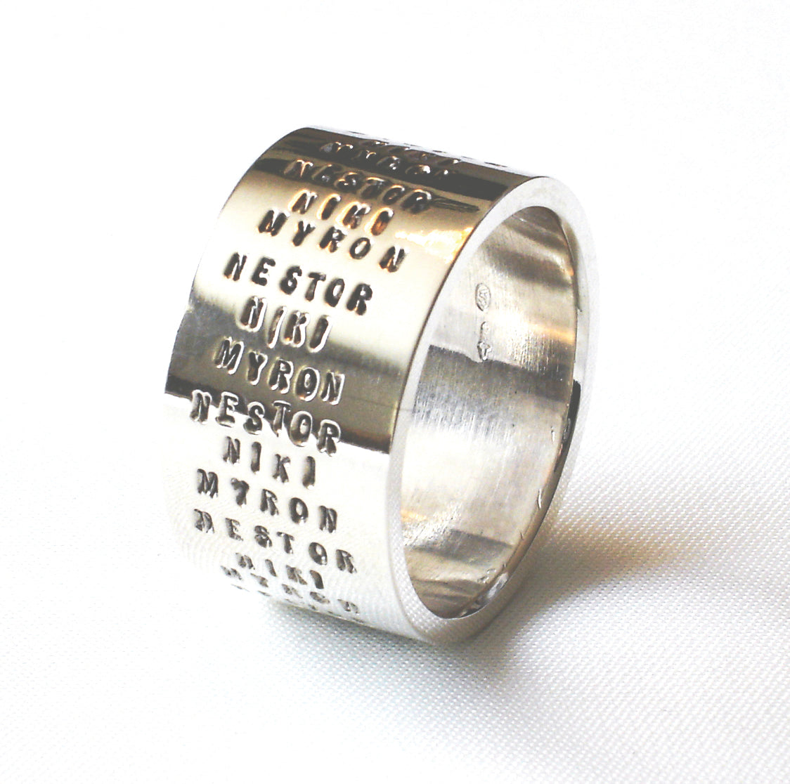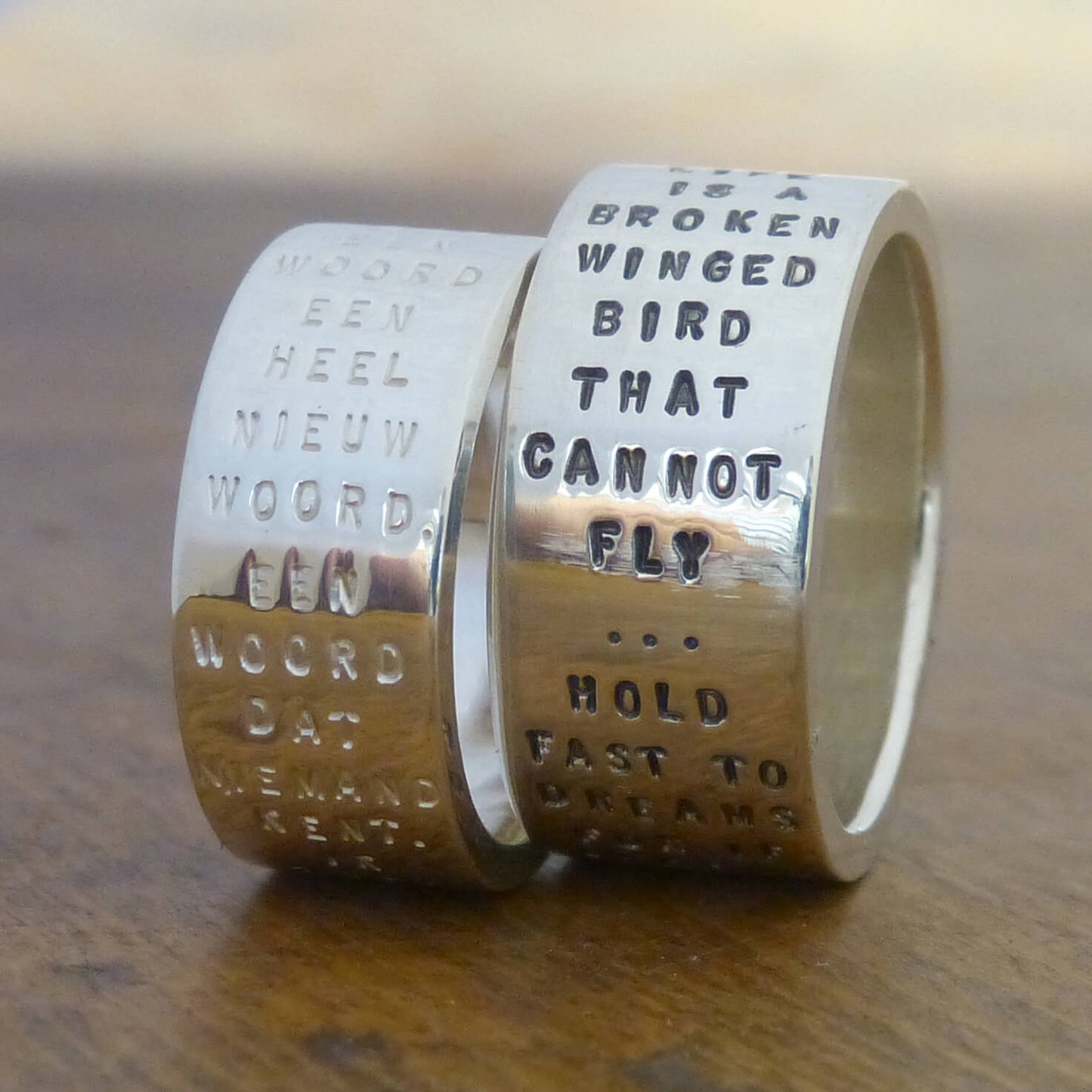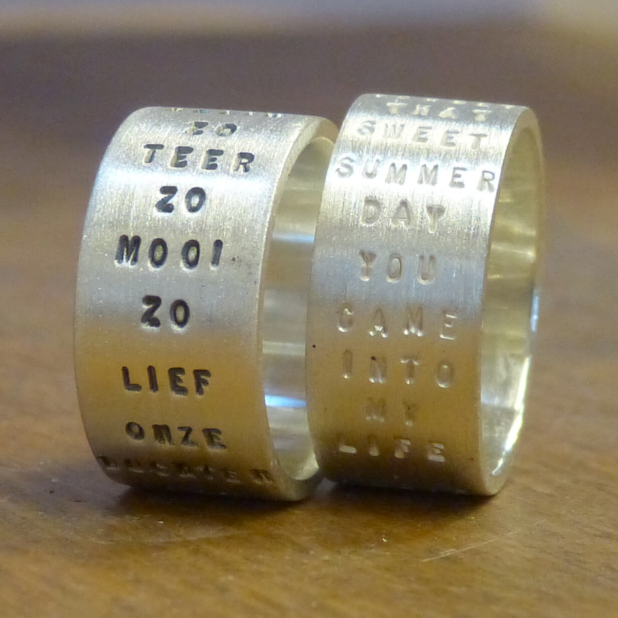 In deze ring slaan we met kleine slagletters jouw persoonlijke tekst. De maat, breedte, dikte en woorden kun je zelf bepalen.De handgeslagen tekst maakt van elke Tekst-Ring een uniek en modern sieraad. De ringen zijn door hun persoonlijke karakter bijzonder geschikt als trouwringen, geboortering, uniek cadeau of sieraad voor jezelf.